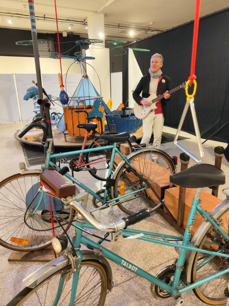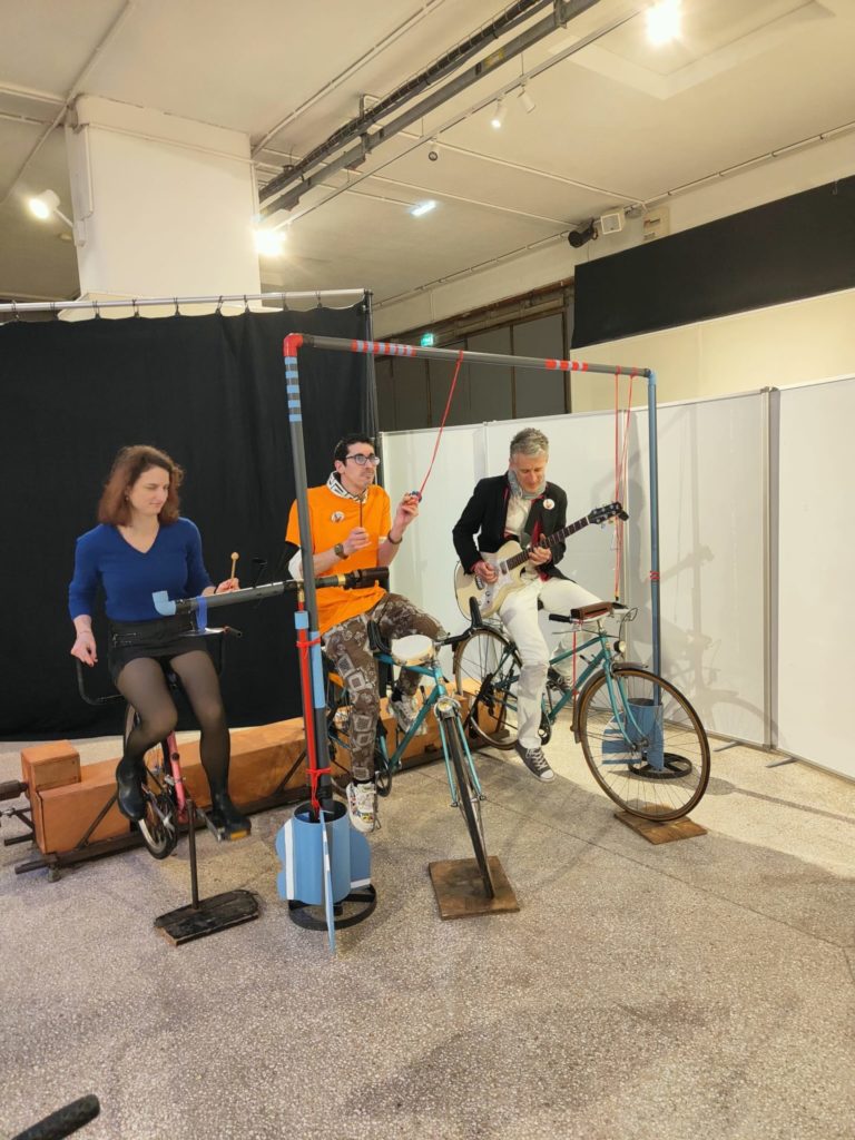 Des parents pédalant et jouant au rythme d’une guitare